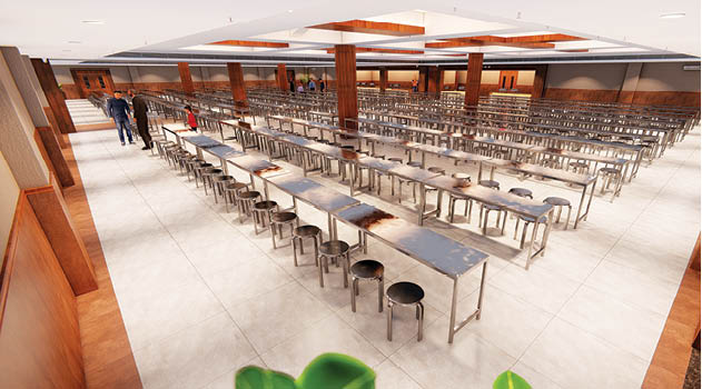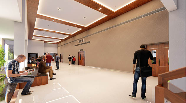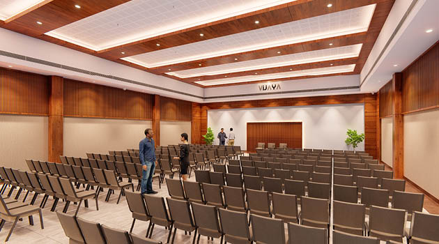 A spacious column – free hall with royal interior, grand ceiling, sound proof design, digital sound and built-in projectors capablee of seating 2500 people at a time.